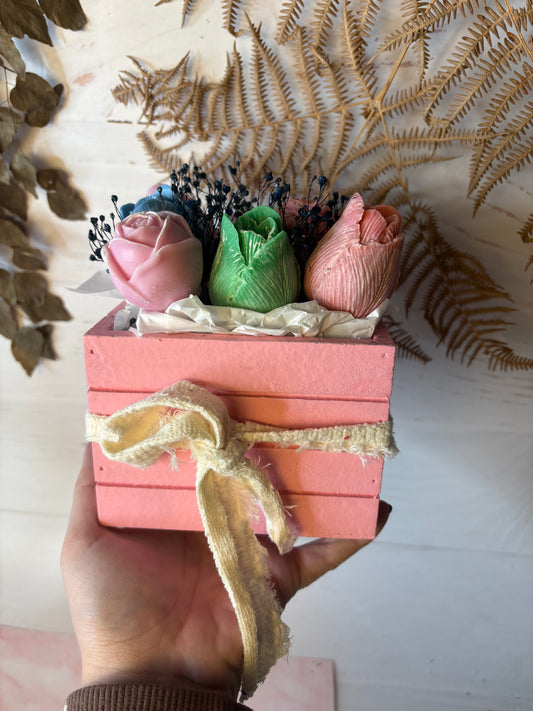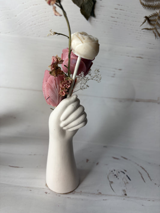 Mano fiorita-composizione vaso con cera e fiori su piattino