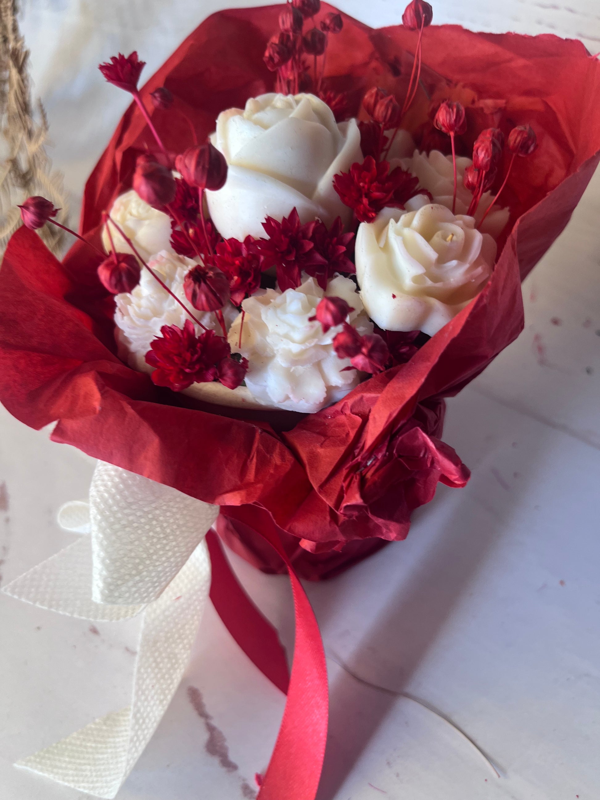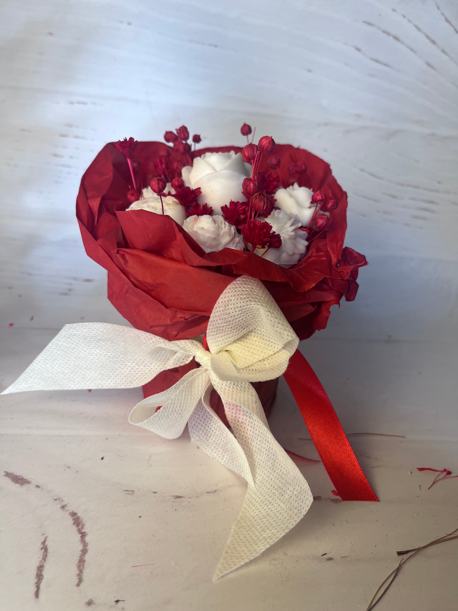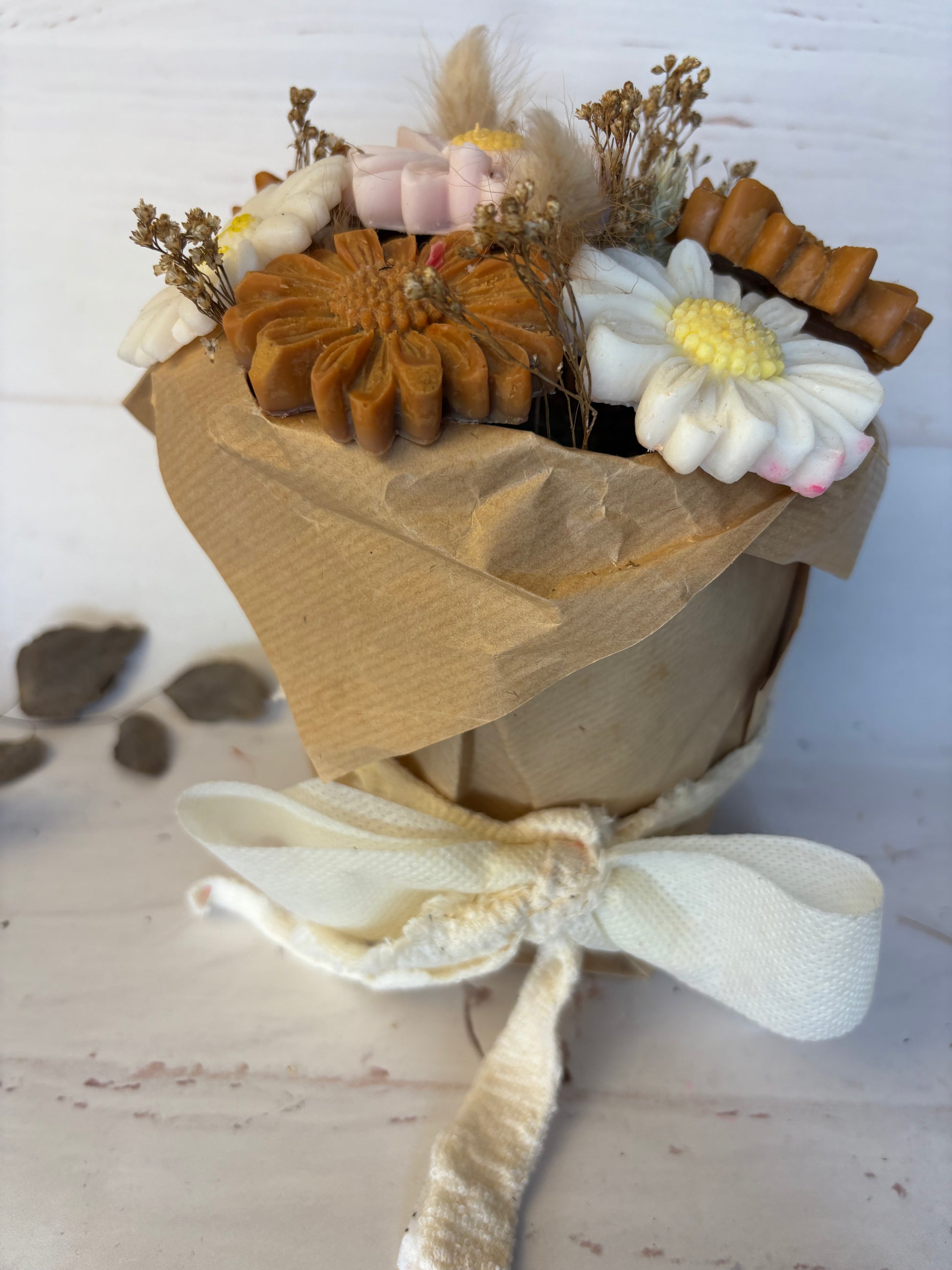 Realizzata con fiori essiccati e fiori in cera di soia, ogni pezzo è unico e personalizzabile.