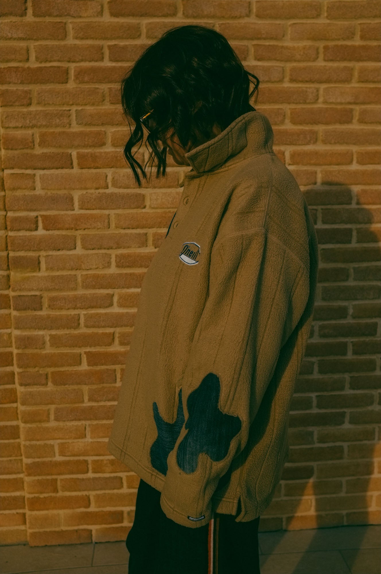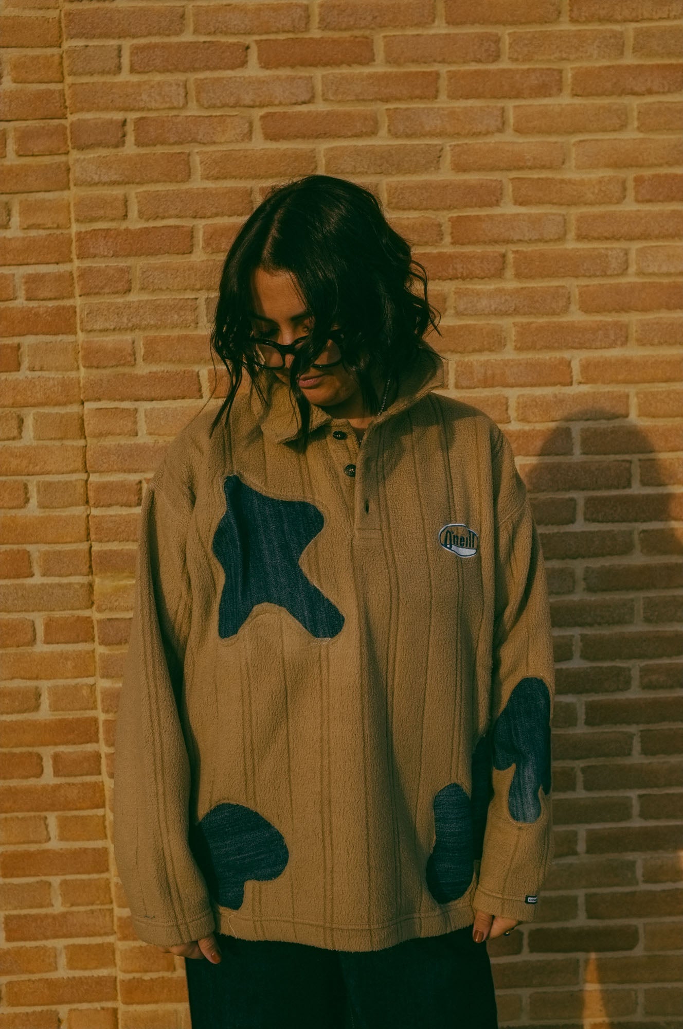 Felpa in pile con inserti in demin, unendo dettagli raffinati a un design sostenibile.