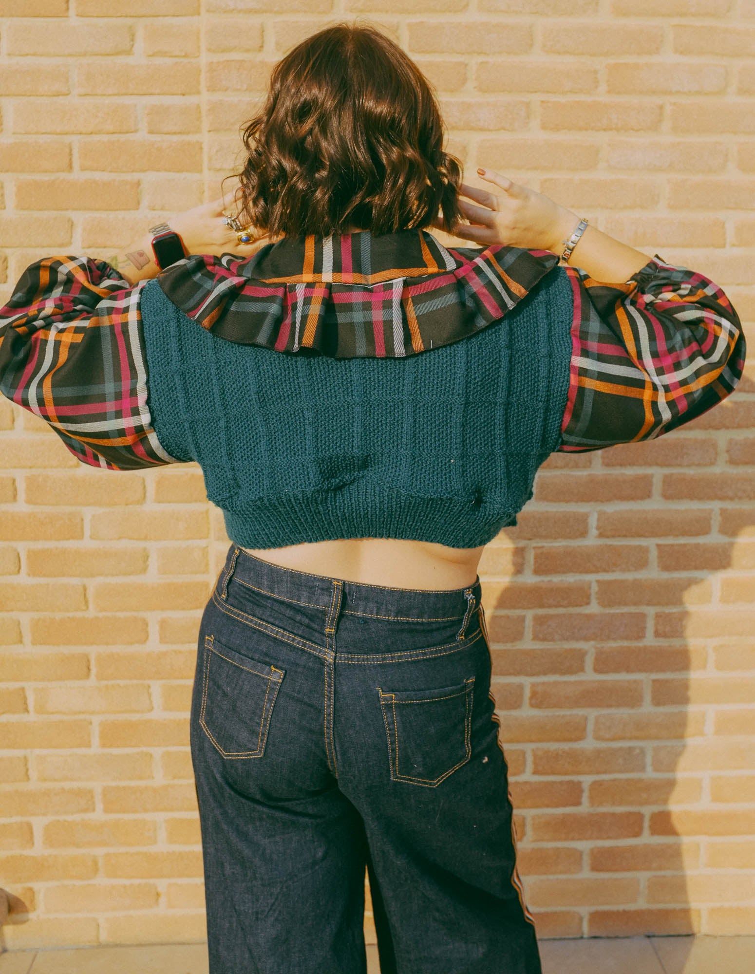 Maglione verde con colletto applicato in tartan e voulant, unendo dettagli raffinati a un design sostenibile.