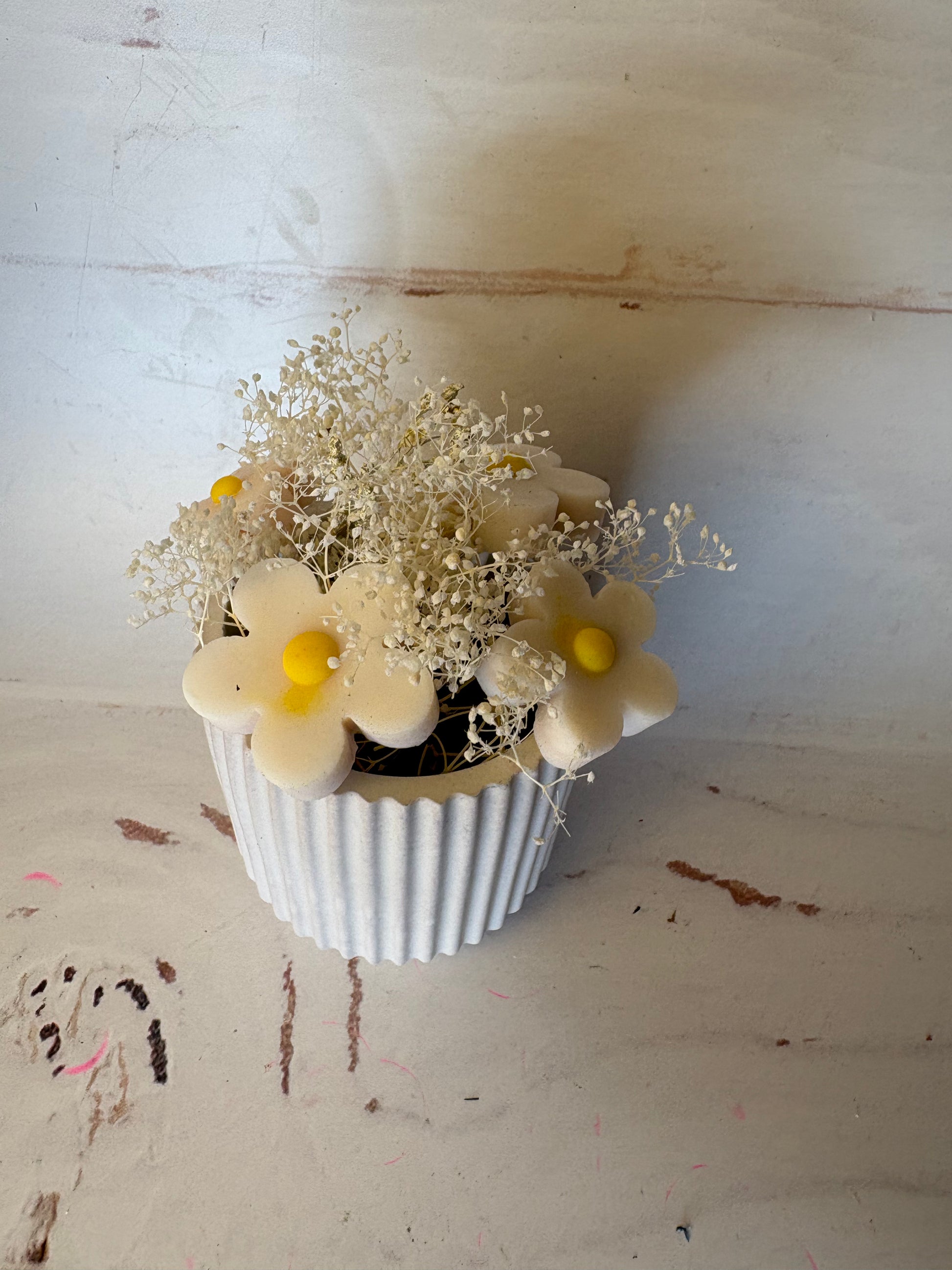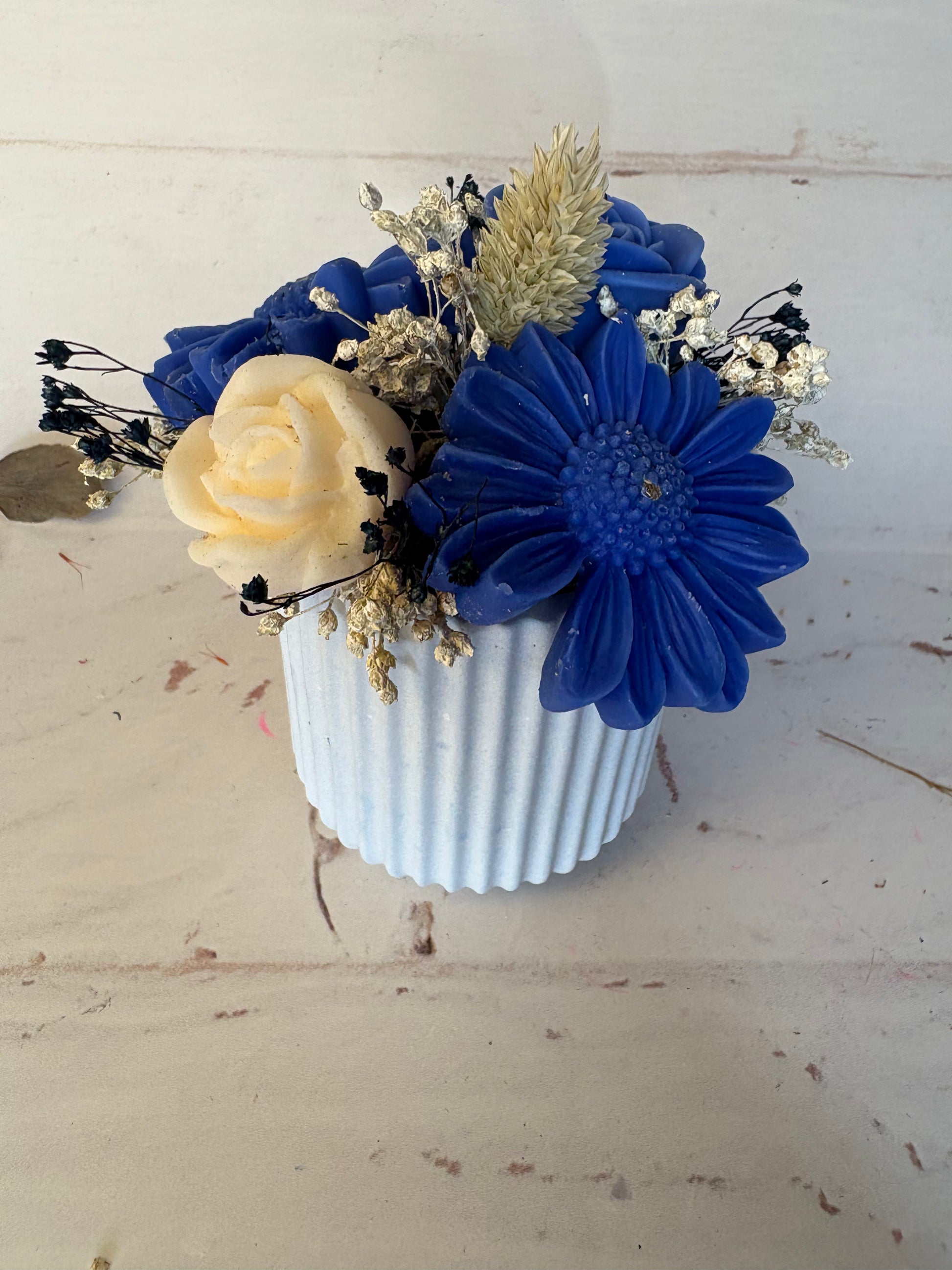 Con un mix di fiori in cera e fiori essiccati, dà un aspetto elegante e naturale.